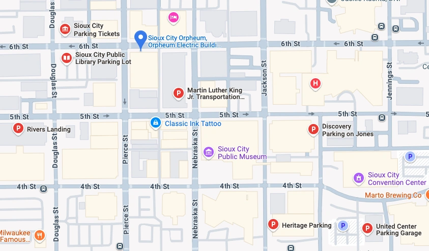 Orpheum Theatre is located at 528 Pierce St. Sioux City, IA 51101. If you are planning to drive to the venue, please be sure to give yourself extra time to arrive. Arriving late may result in being asked to wait in the lobby until an appropriate break period.